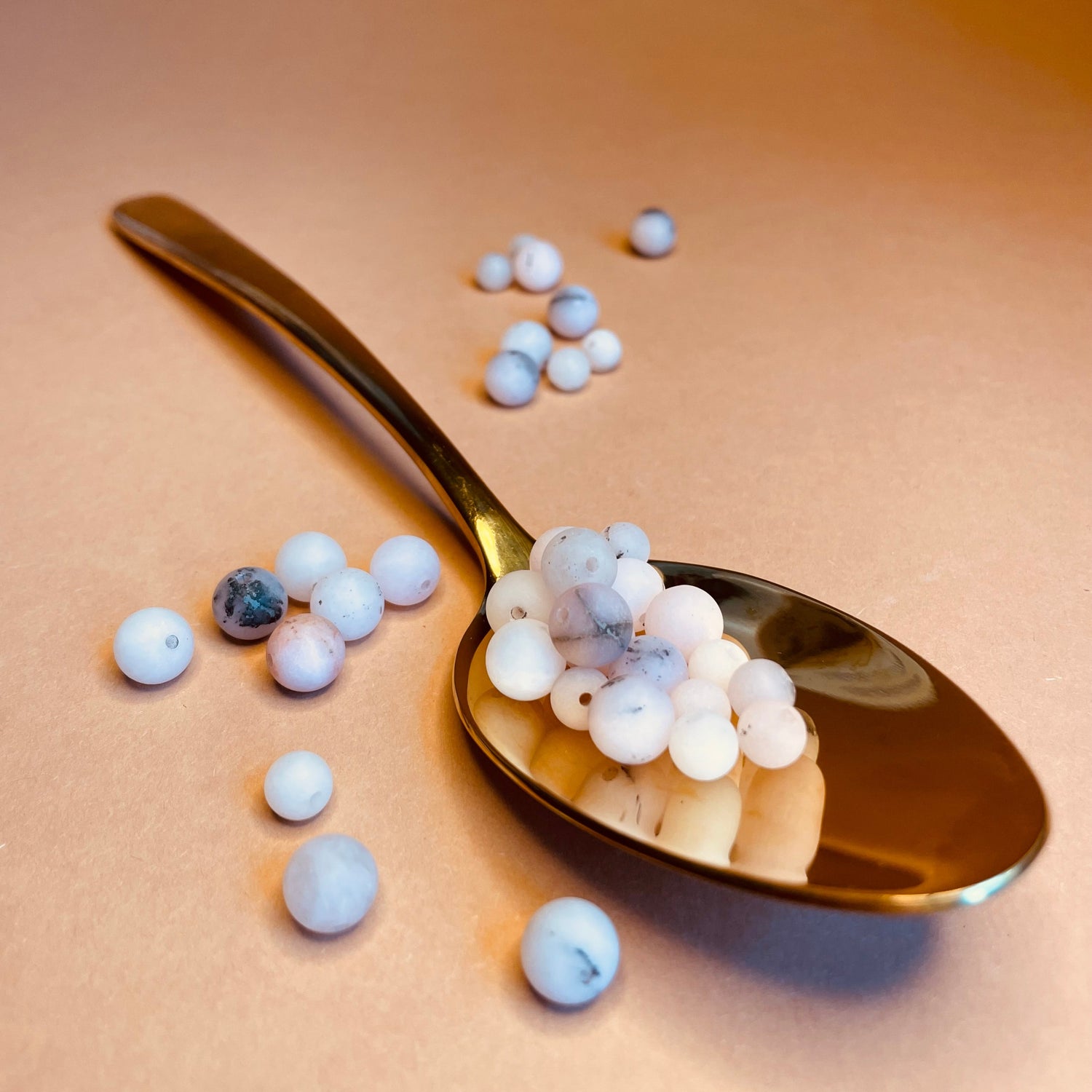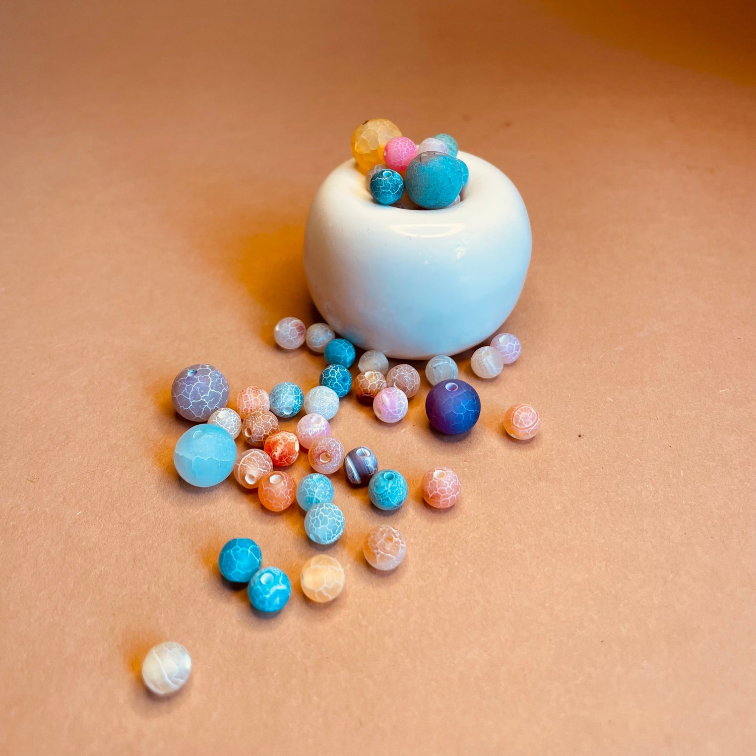 A matt, repesztett achát különleges textúráját a hirtelen hőmérsékletváltozás hozza létre, amely finom repedéshálóval teszi egyedivé minden gyöngy felületét. A színezett változatok vibráló árnyalatait a kő természetes erezete tovább fokozza, így minden darab játékos és megismételhetetlen hatást kelt.