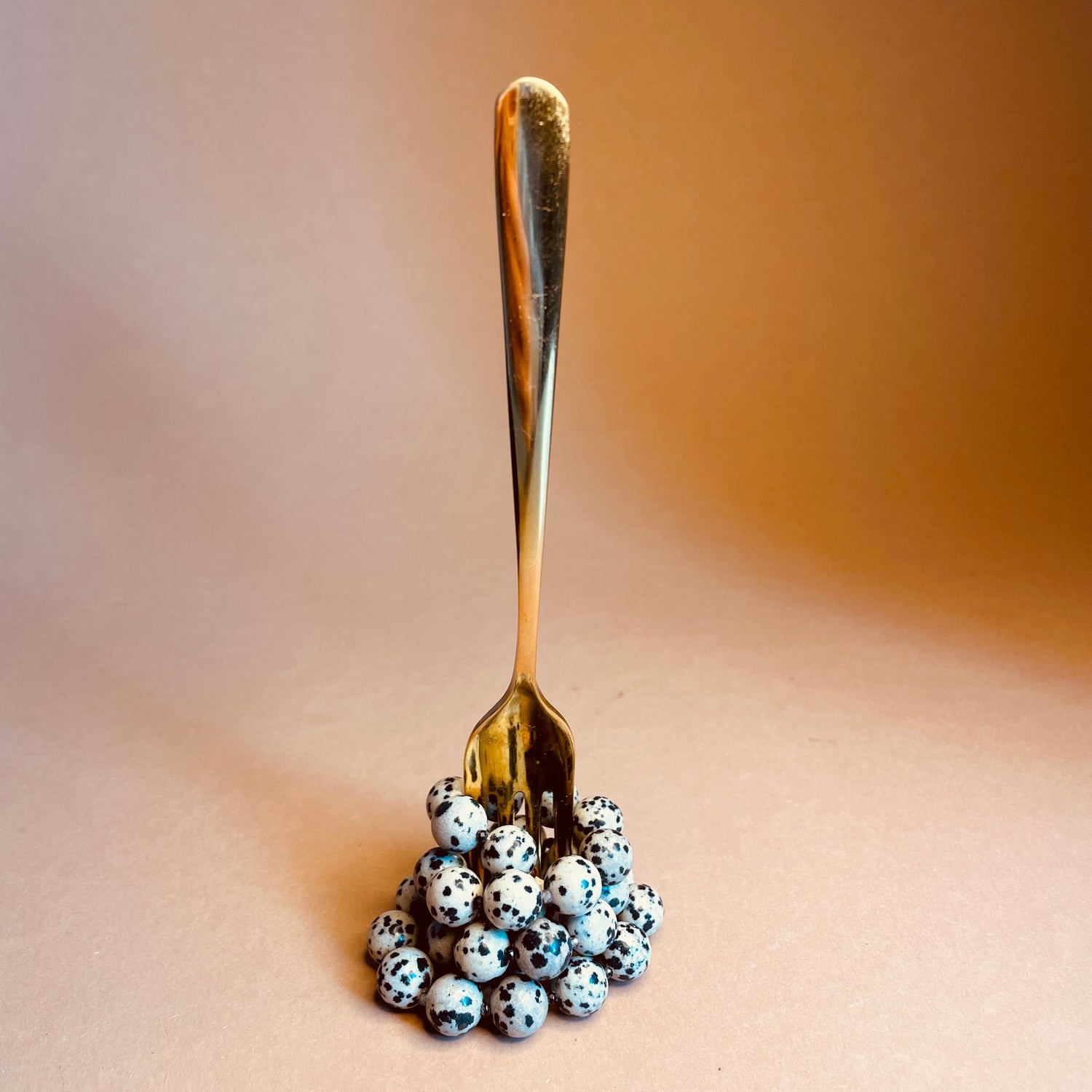 A krémes, világos alapon elszórt fekete pettyek egyedi, dalmata-mintás kontrasztot teremtenek, amely nem csak látványos, de minden egyes gyöngyöt megismételhetetlenné tesz.