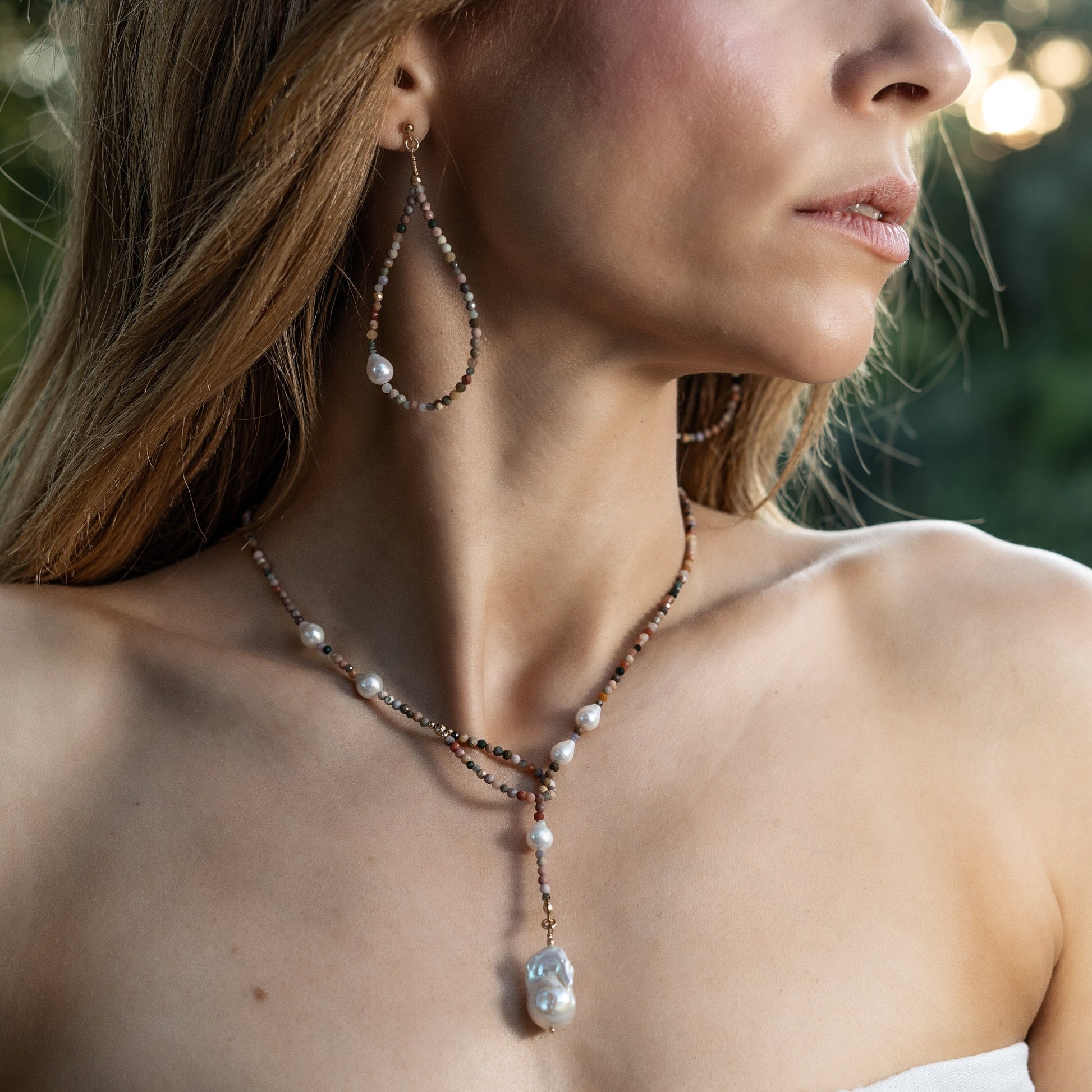 Párosítsd a hozzá illő Alasie Lariat Nyaklánccal vagy az Alasie Trióval, hogy a gyöngyök játéka stílusos, ugyanakkor diszkrét egységet alkosson.