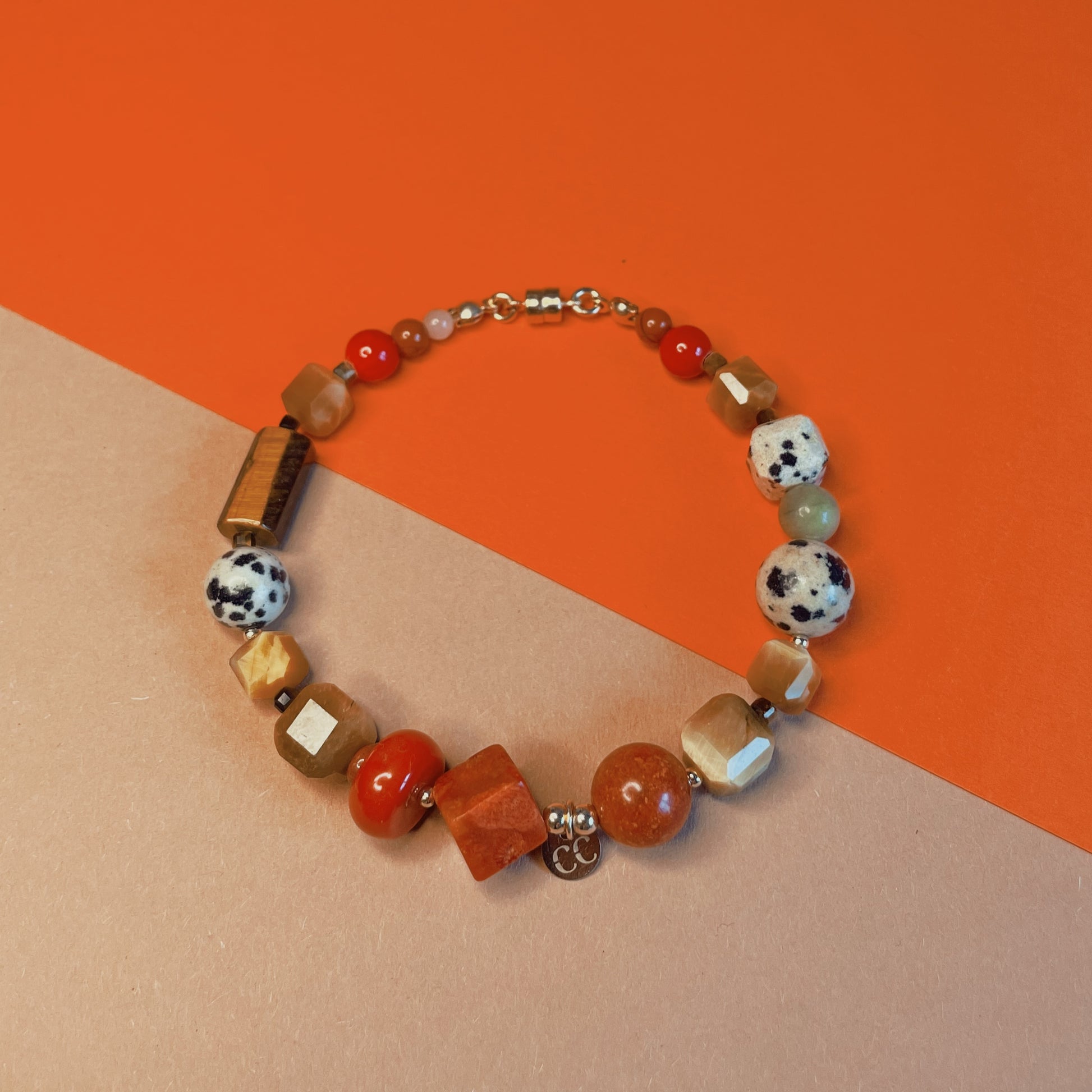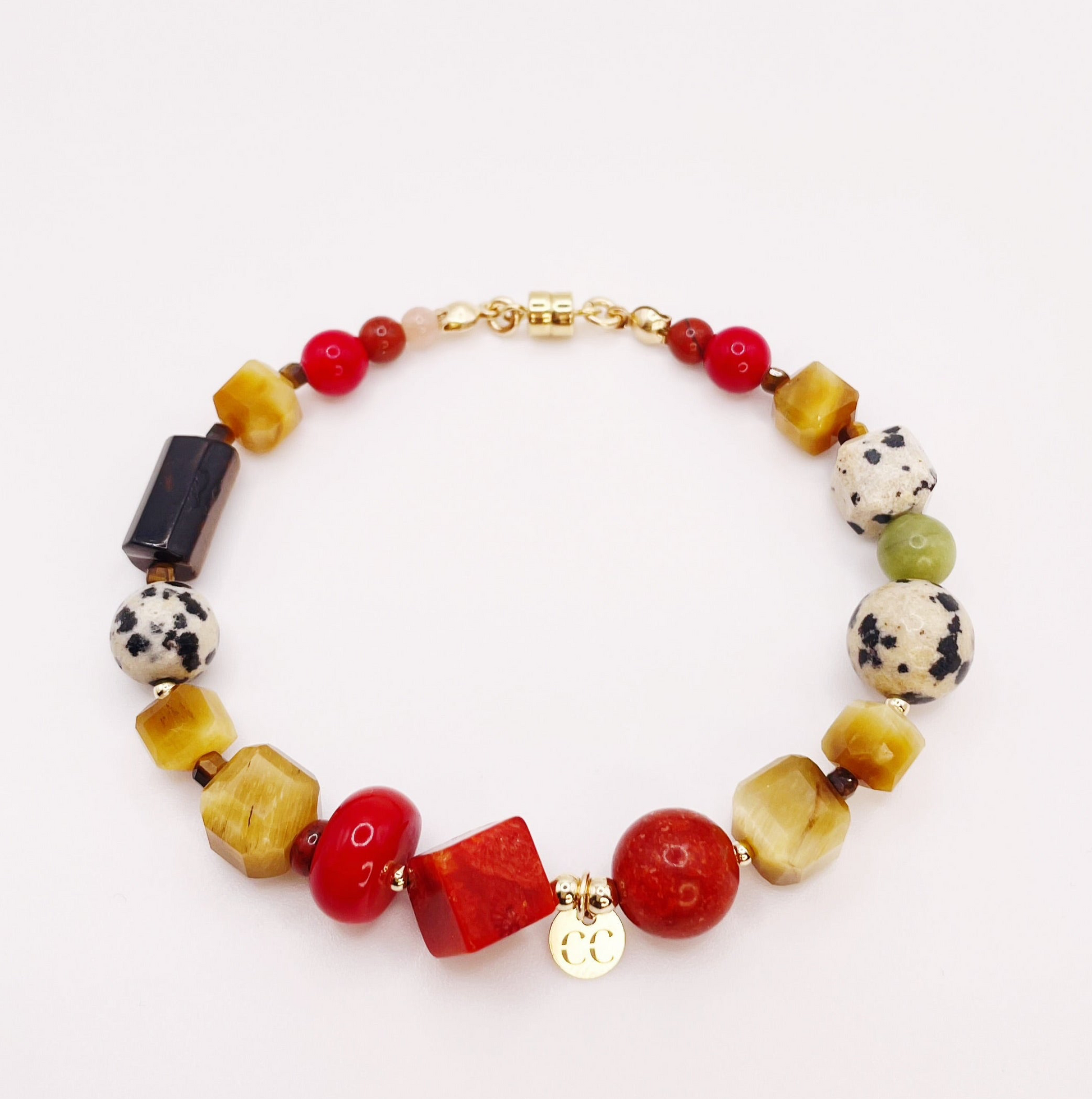Ez a karkötő a hideg hónapok gazdag színpalettájának gyűjteménye. Formái és színei a legfinomabb gondossággal lettek összeválogatva, hogy tökéletes harmóniát alkossanak. Viseld, és válassz minden eleméhez egy kedves emléket, egy boldog pillanatot, vagy egy érzést, amelyet a karkötő örökké elraktároz számodra.