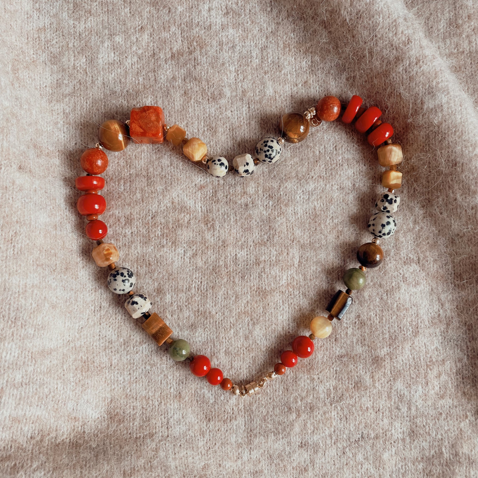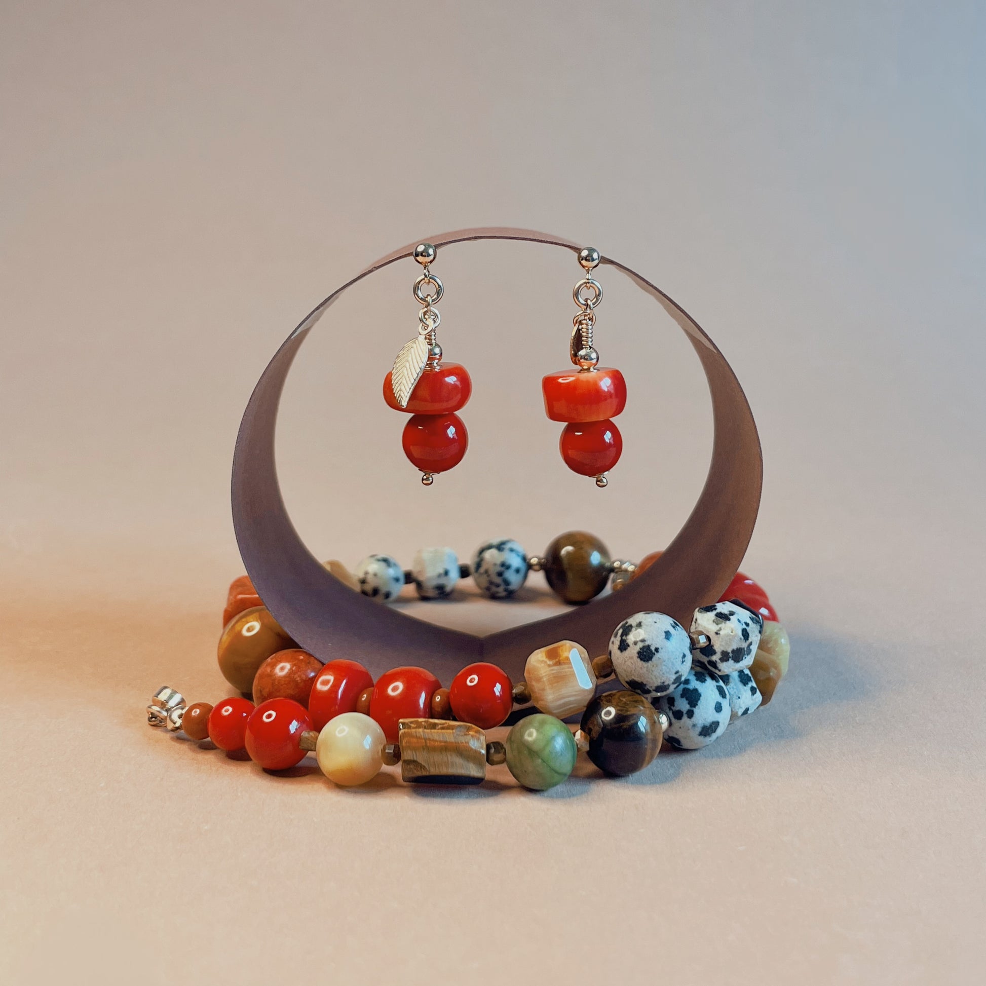 14 Karátos Arany Töltetű Szerelékek, Korall Gyöngy, Dalmata Jáspis és Tigrisszem Gyöngy