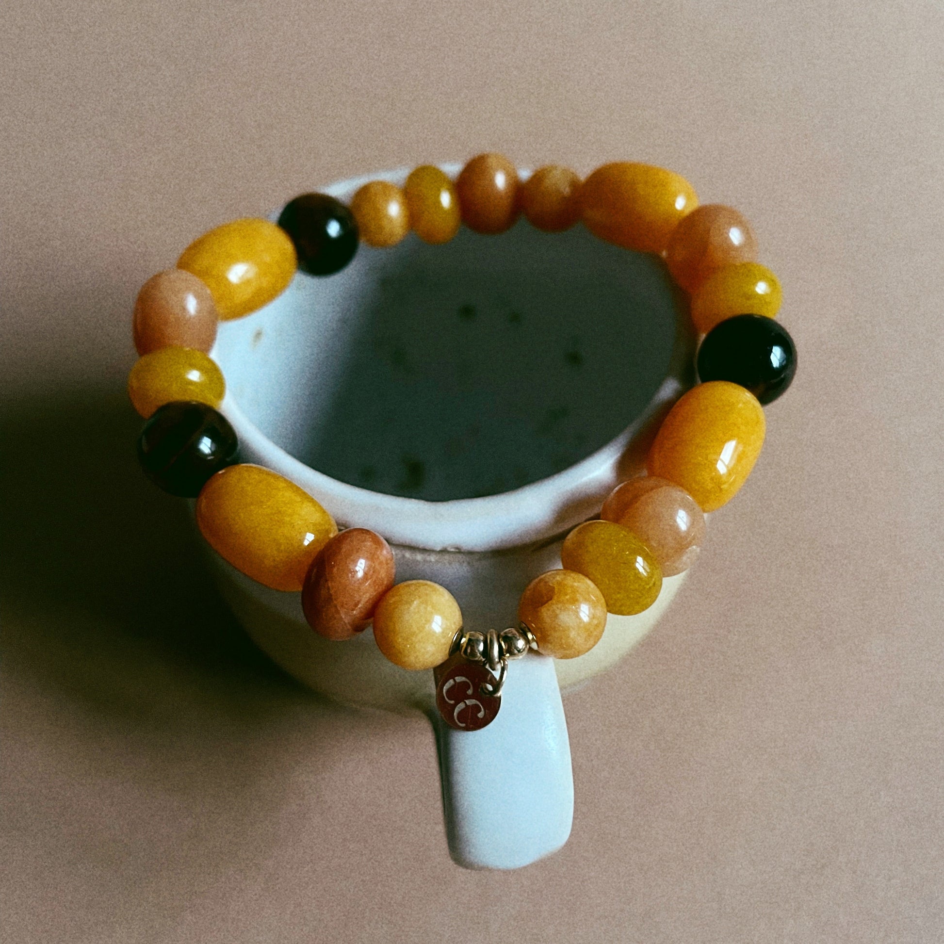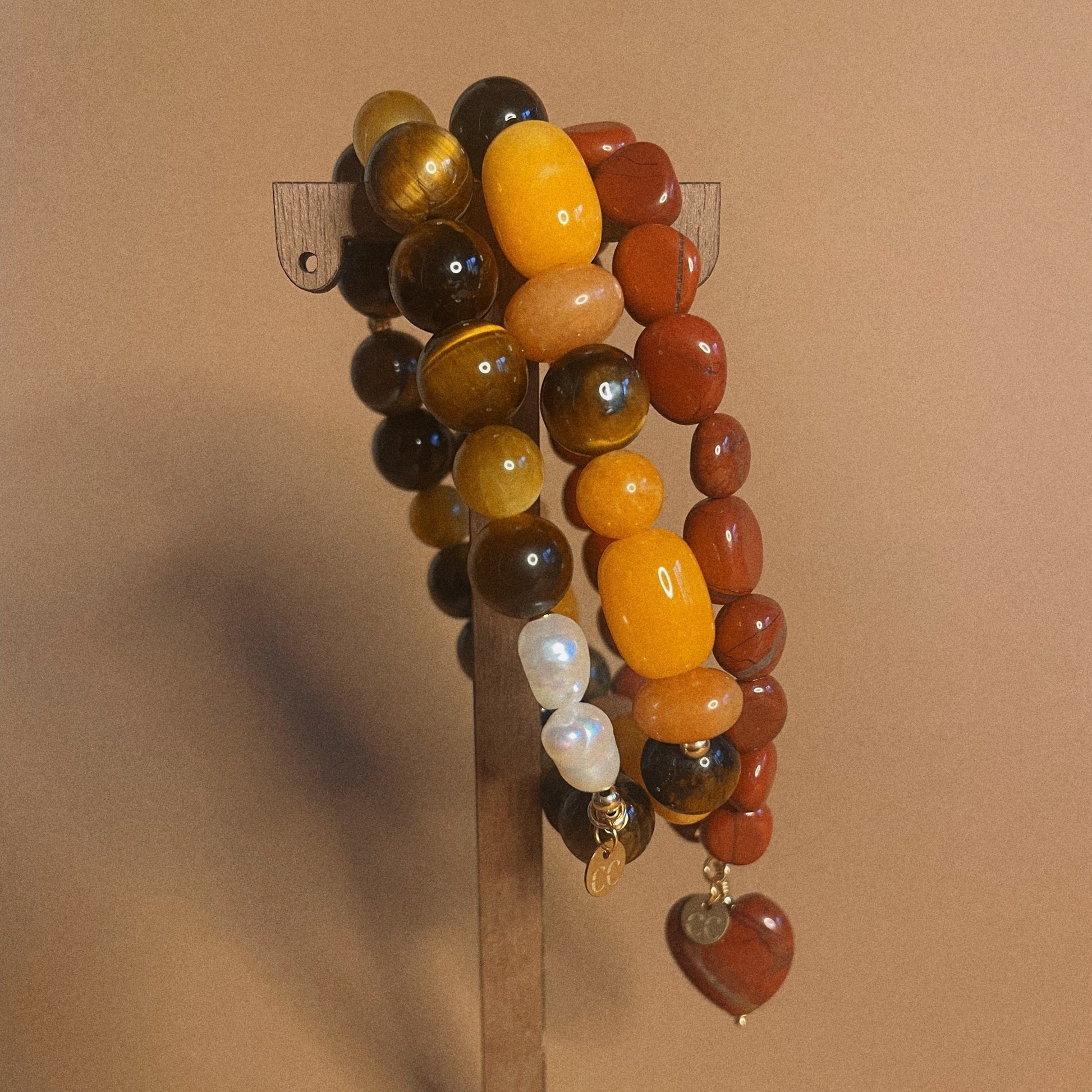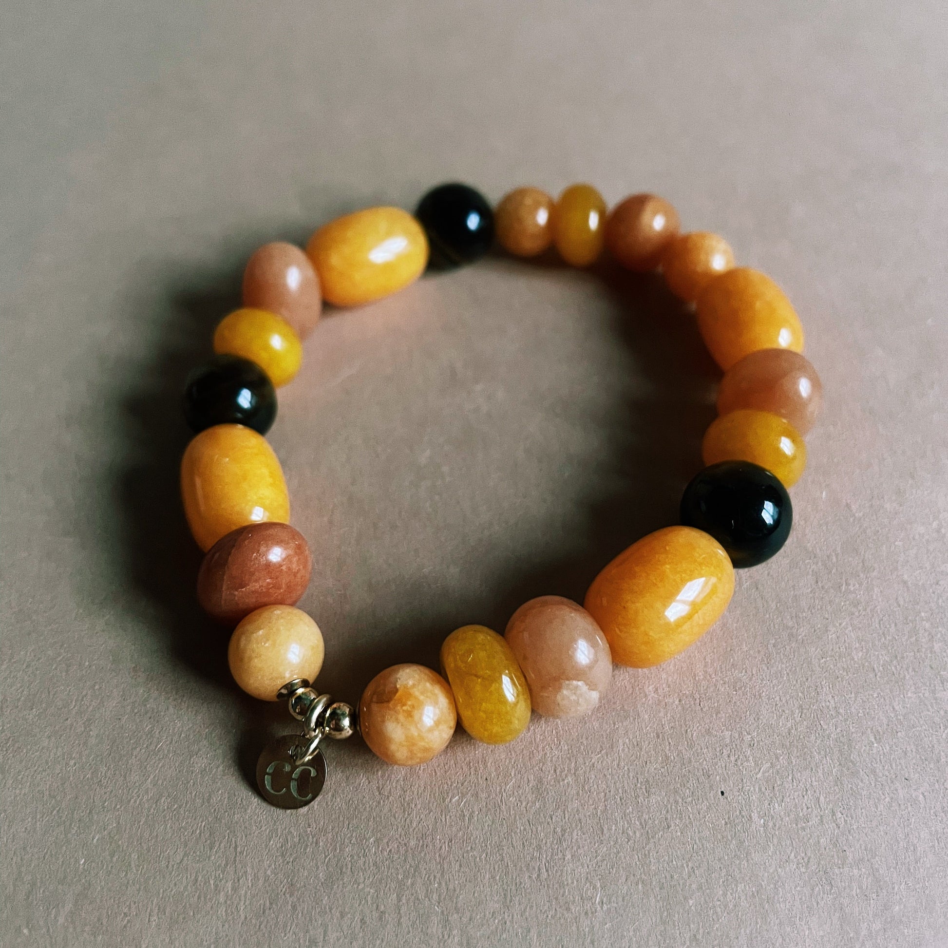 - Vibráló színterápia: A narancssárga jadeit és a barackos aventurin árnyalatai azonnal jókedvre derítenek, a tigrisszem selymes fénye pedig mélységet és eleganciát kölcsönöz a darabnak.