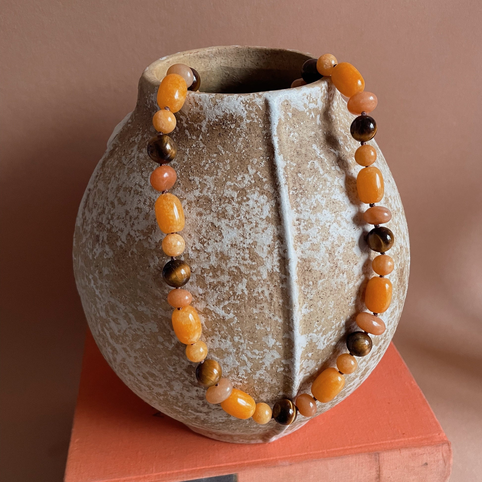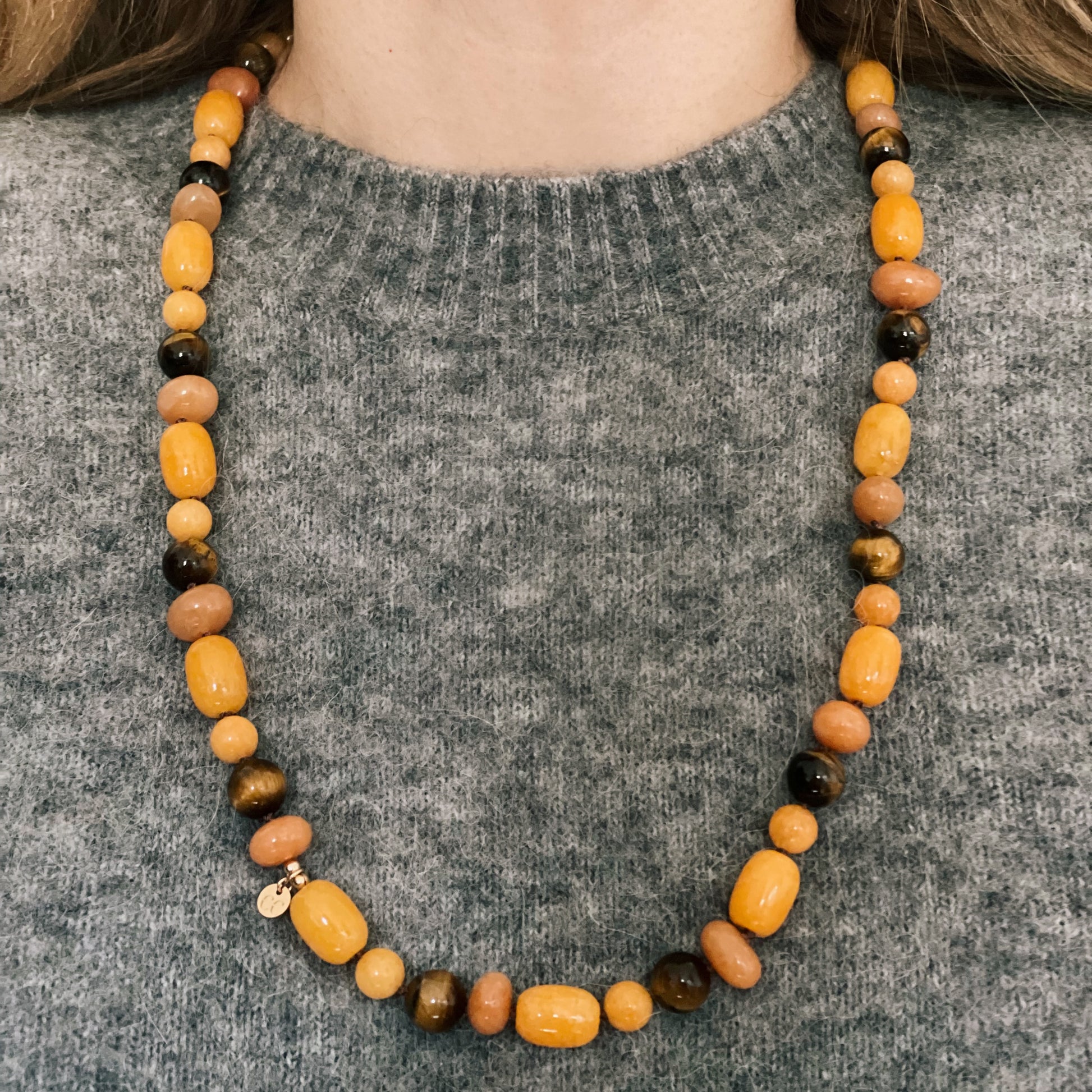 Clementine Nyakláncunkat a mediterrán nyarak gondtalansága ihlette. A lédús narancsot, frissítő barackot és földszíneket idéző ásványgyöngyök jókedvre derítenek és élettel töltik meg a megjelenésedet. Olyan, mint egy selymes vitaminbomba, amelyet minden nap szívesen hordasz.