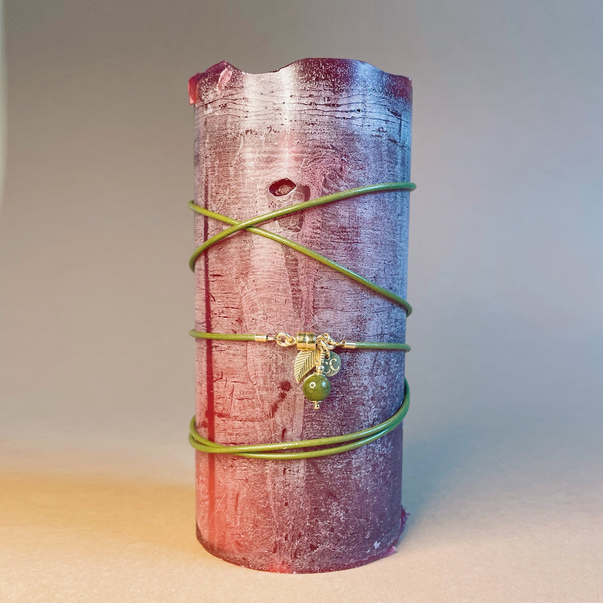 A két végén praktikus mágneszár van, az egyik oldalon pedig egy apró, kecses levélmotívum és egy zöld jáspis teszi teljessé a különleges aszimmetrikus dizájnt.