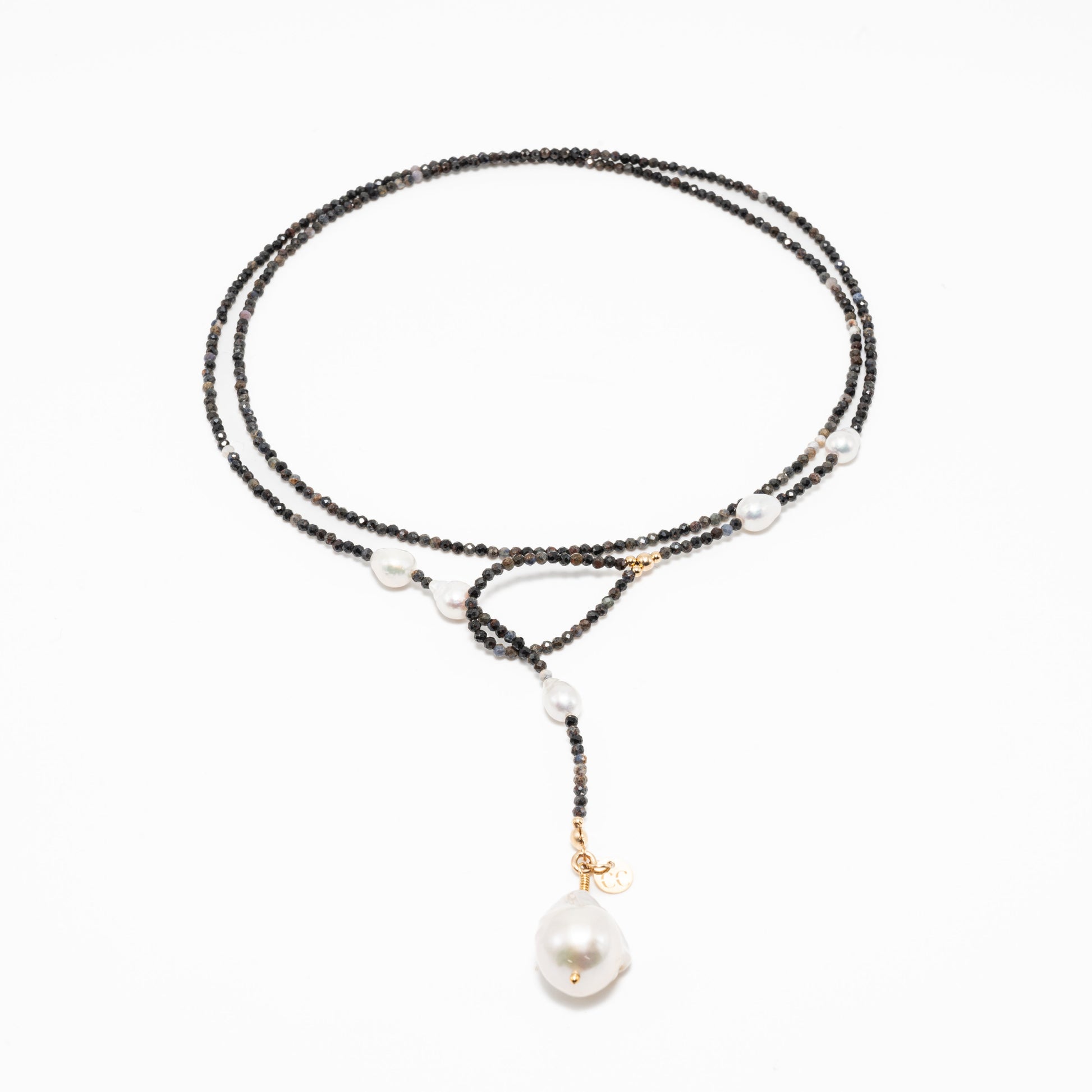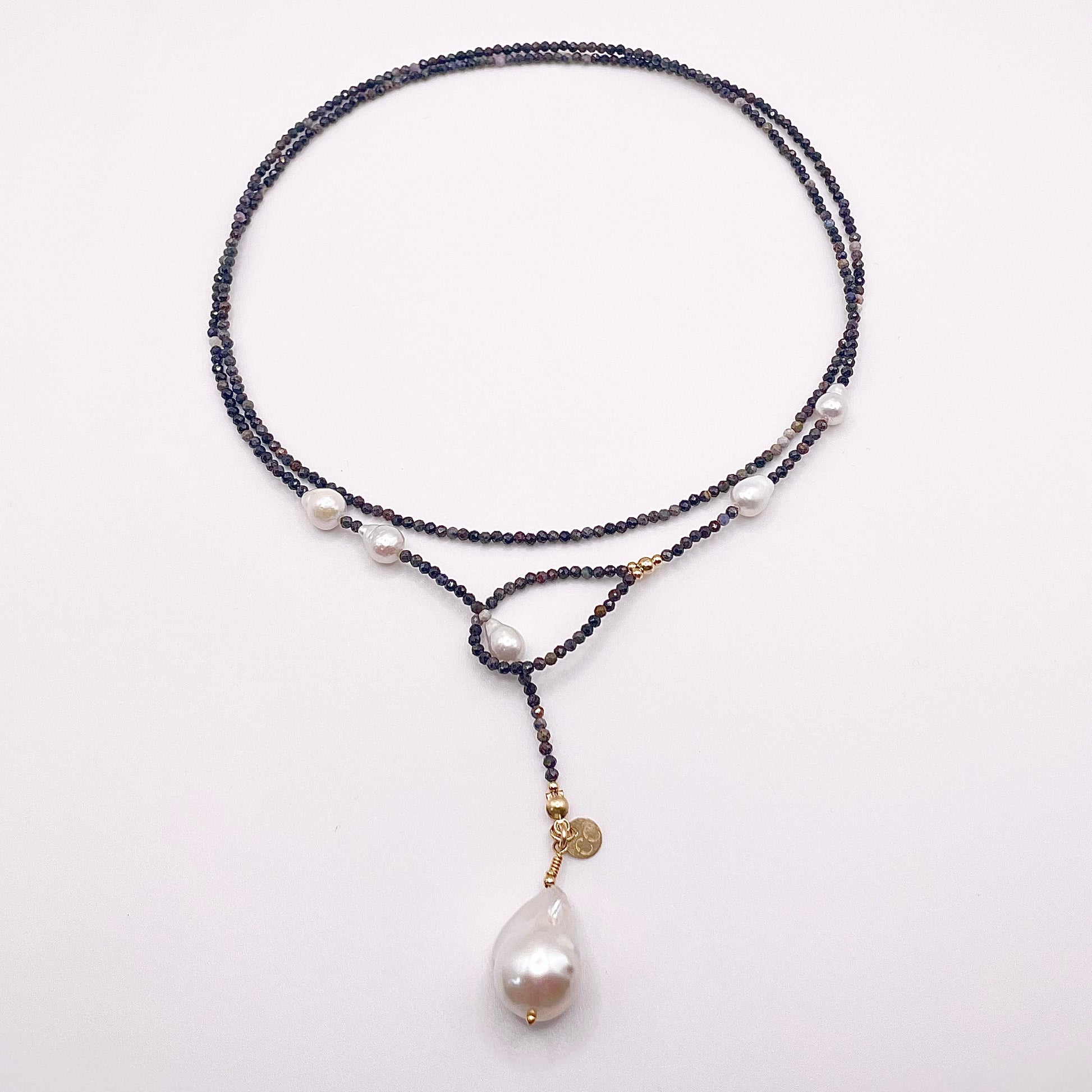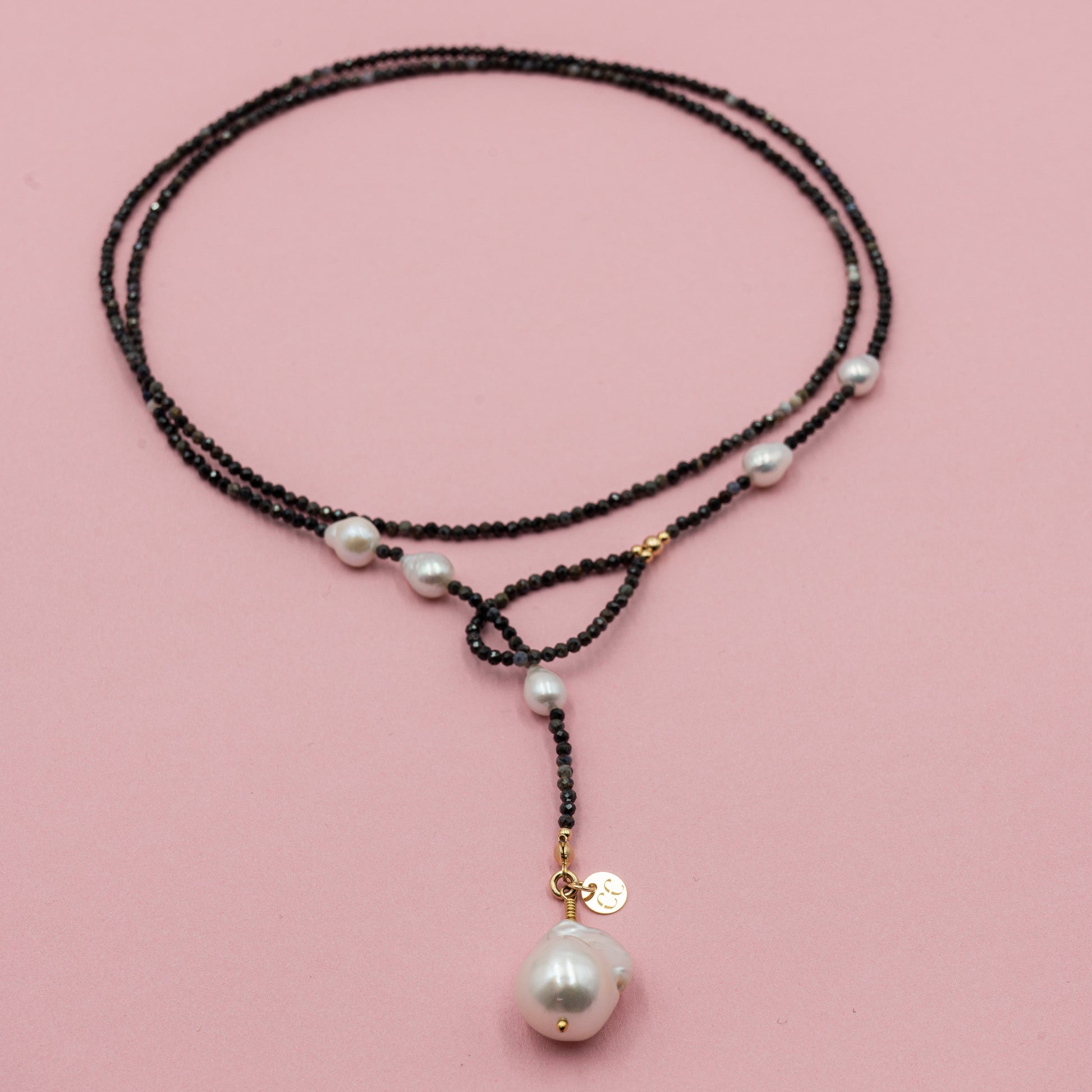 Középpontban egy gyönyörű barokk gyöngy a maga szabálytalan tökéletességével, 14 karátos arannyal futtatott szerelékek ölelésében.