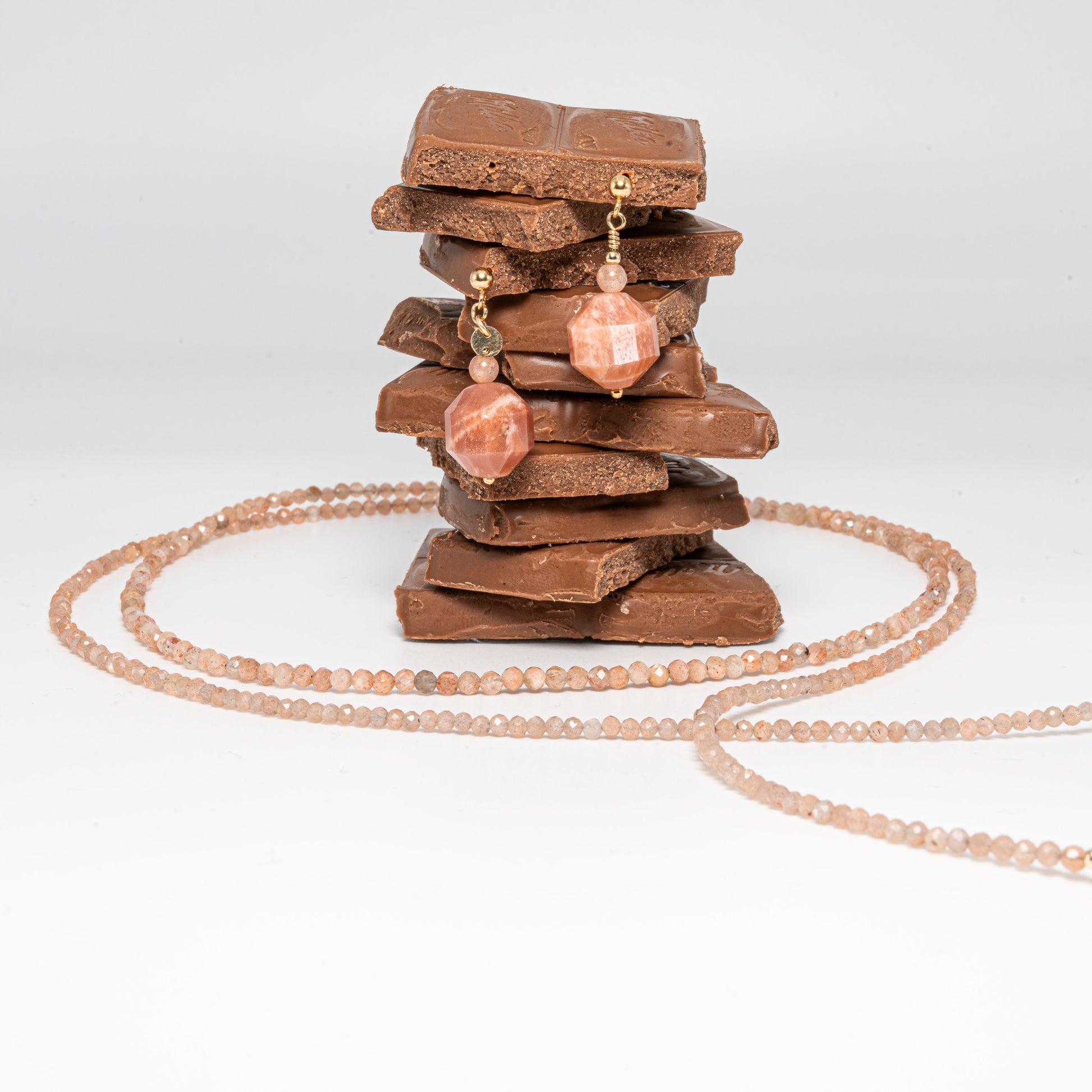 Egy aranyló pillanat, amit csak az lát, aki elég közel hajol. A napkövek selymes fénye nem vakít, hanem izzik - lágyan és melegen, mint egy tekintet, amely hosszasan időzik a nyakvonaladon.