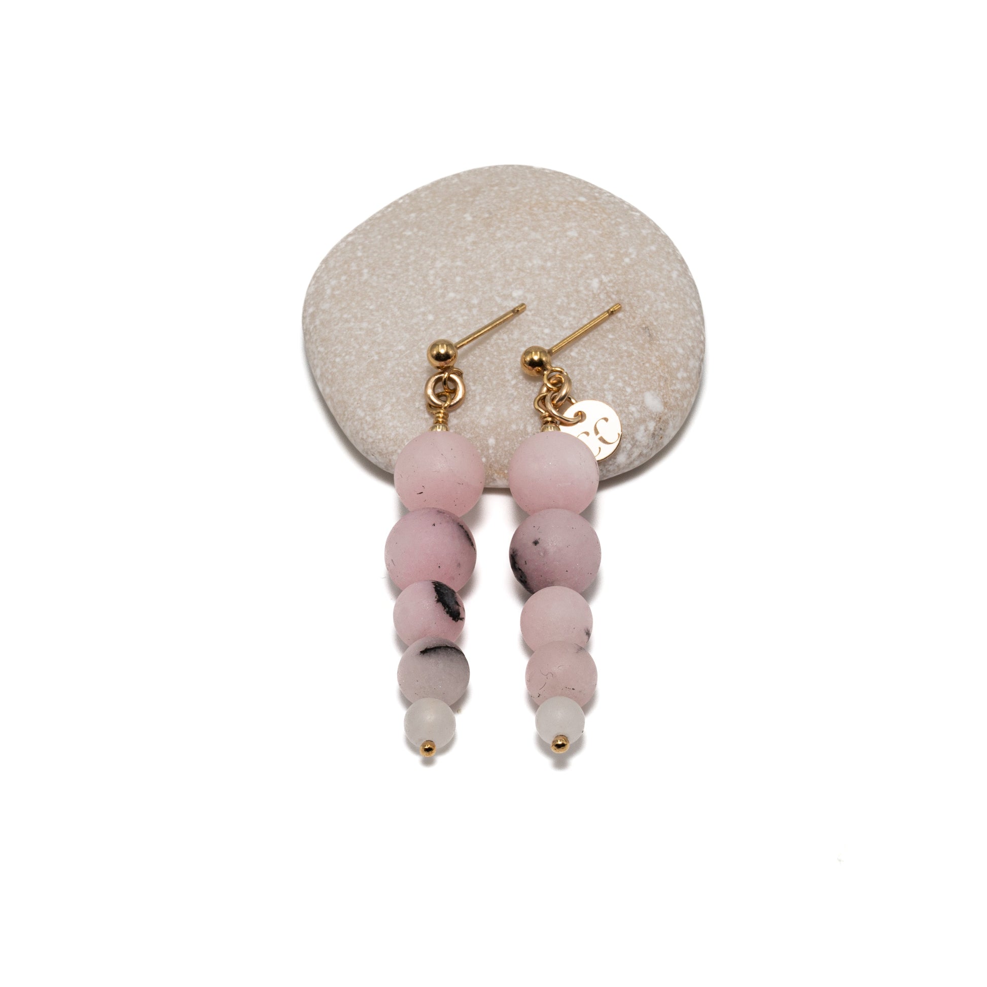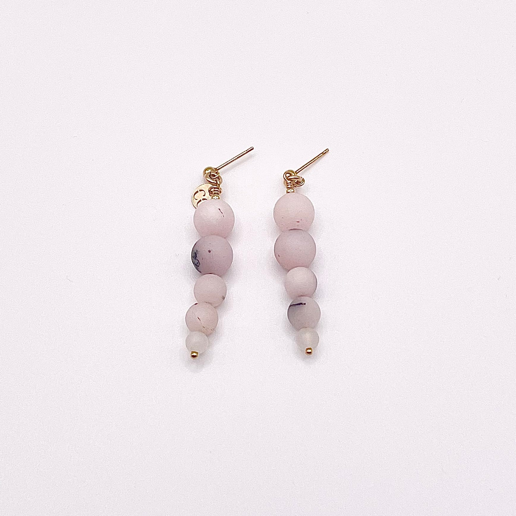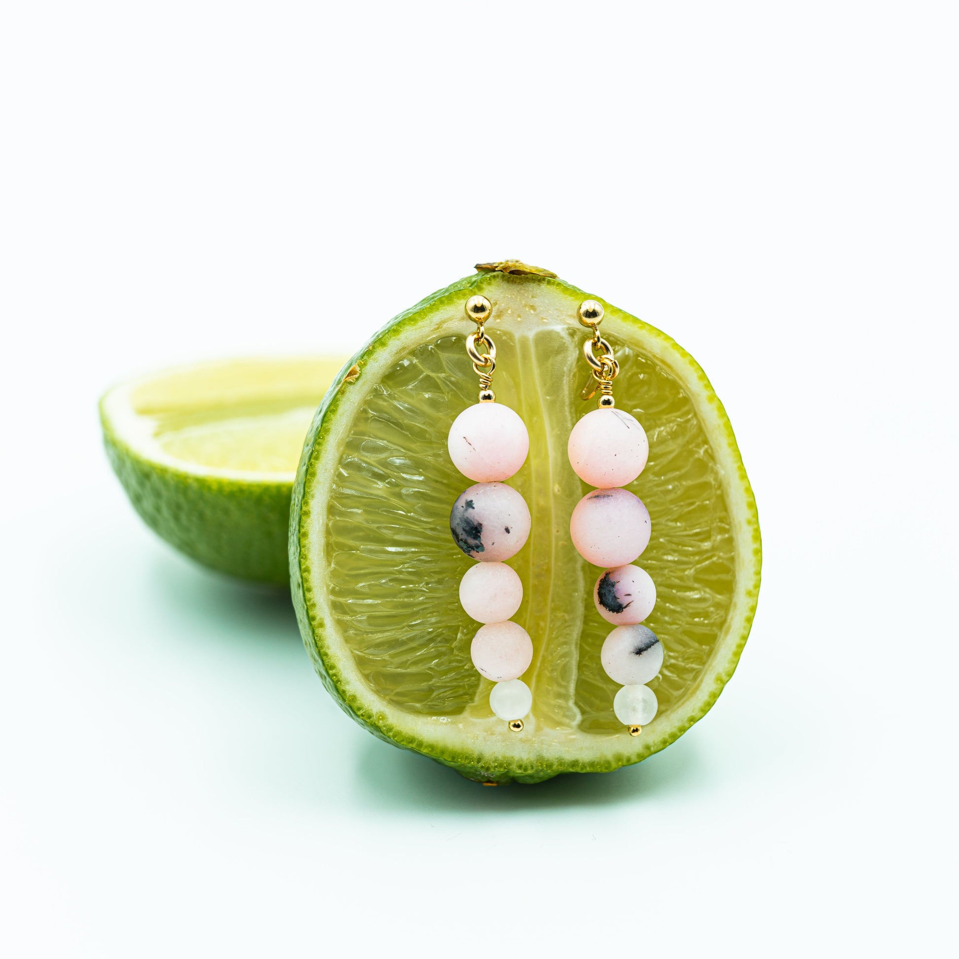 A cseresznyevirág-jáspisok rózsás árnyalata és a selymesen fénylő rózsakvarc gyöngyök harmonikus egységet alkotnak a 14 karátos arannyal futtatott szerelékek csillogásával.